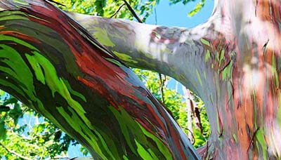 • الوان شجرة قوس قزح : تنتج الوانها بسبب تساقط جزء من اللحاء الخارجي في اوقات متفرقة من السنة الامر الذي يجعل اللحاء الاخضر الداخلي ظاهرا وبعد ذلك يغمق لونه ويصبح اكثر نضجا مما يعطي تموجات لونية مميزة ومتعددة متدرجة بين البرتقالي و البنفسجي و الازرق.